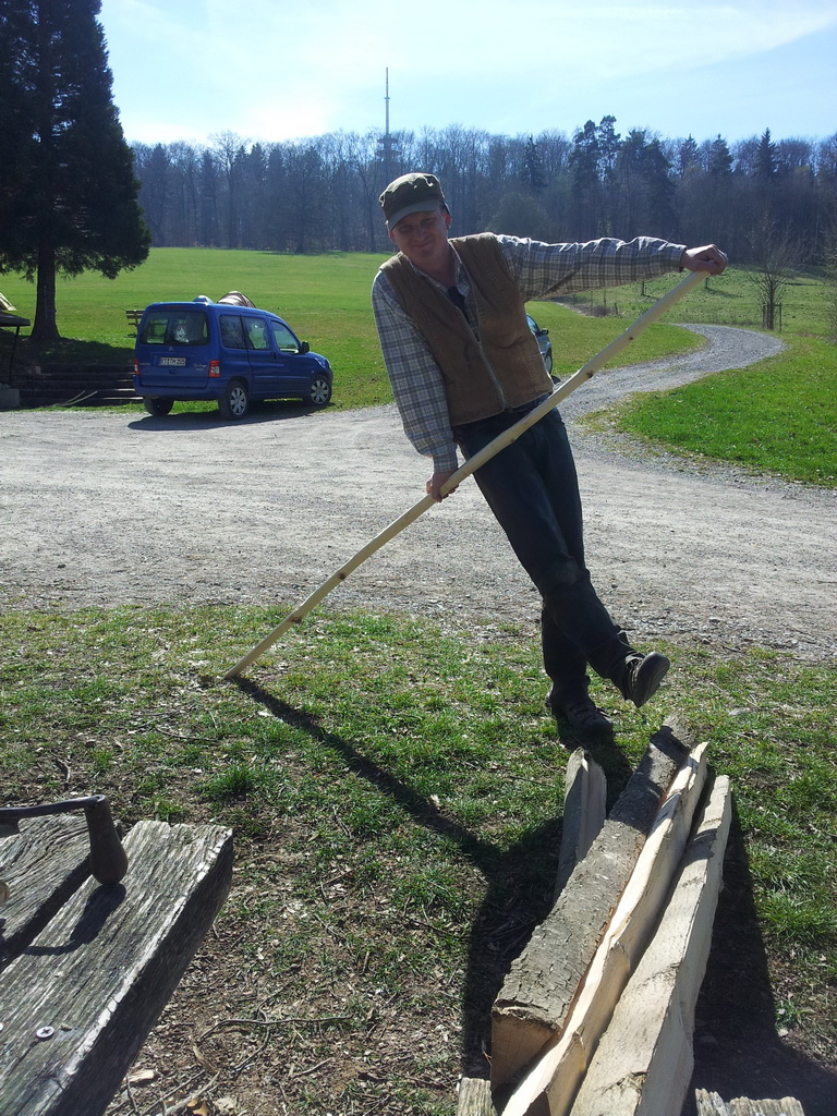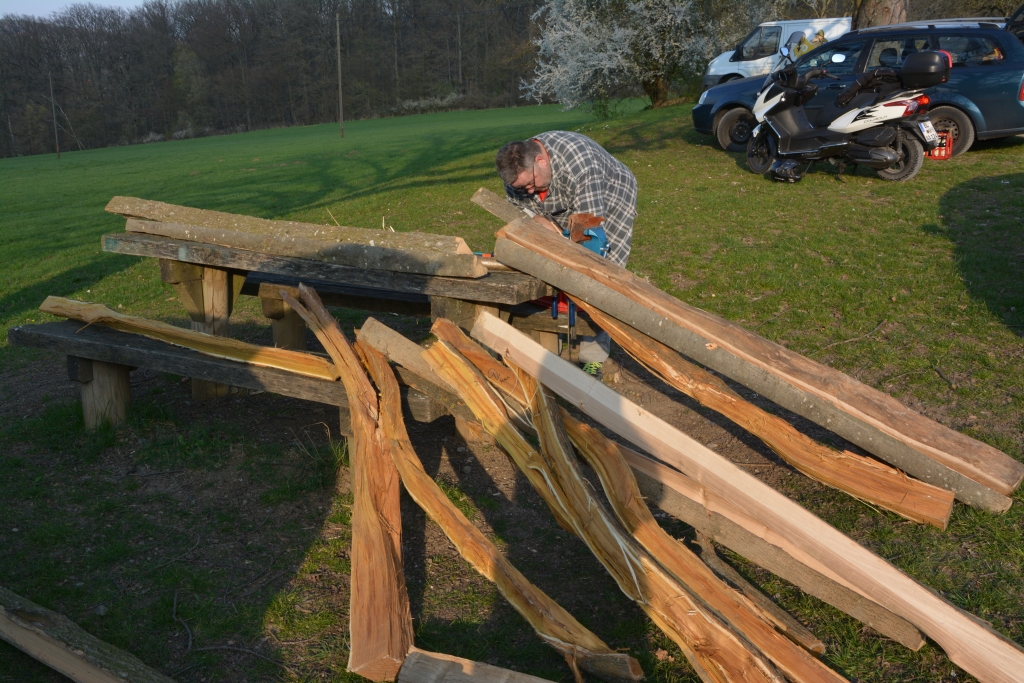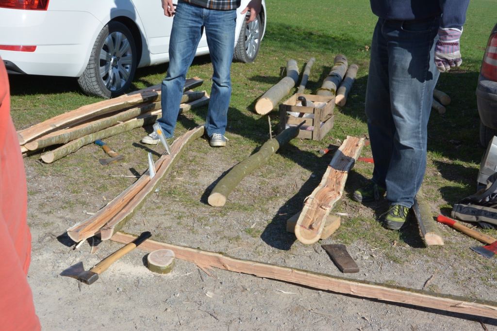 Bis zum Mittagessen brachte ich also den Bogen auf Maß und fand auch einen Rückenring, der leidlich sauber gemacht wurde, und dann wurde an eine mögliche Wurfarmdicke rangetastet. Es war eine herrlich entspannte Stimmung, grandioses Wetter, rundherum wurde gearbeitet, gescherzt und gelacht, Holz begutachtet, Späne flogen wenn ein Stave mit Beilhieben auf grobes Maß gebracht wurde, hin und wieder knarzte der Tillerbaum. Hach, einfach herrlich. Dann drehte der Wind, und ich konnte kaum noch einen klaren Gedanken fassen, weil das herrliche Essen, das da zubereitet wurde, immer wieder Duftschwaden in meine Richtung schickte, der Magen hörbar knurrte, und ich ständig bemüht war nicht auf den Stave zu sabbern. Als ich mir dann den Wanst mit zwei vollen Tellern gefüllt hatte, gings mir wieder besser. Hab ich die Kochkünste vom Beblibrox schon gelobt? Ja? Macht nix, kann man nicht oft genug loben!