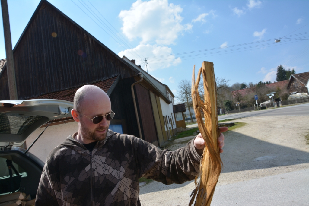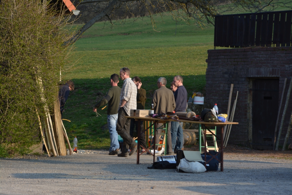 Der Abend wurde mit Grillen, Essen, Bier trinken, Lagerfeuergesprächen und den fleißigen, die unermüdlich an ihren Bögen oder Pfeilen arbeiteten, begangen. Deckelsmoogs Bambuspfeilbefiederung war sehr lehrreich, der Neugier ging seinen Osage an, es wurde über Werkzeug diskutiert, und ich hab was über Ziehklingen dazugelernt. Als die ersten nasalen Schlaflaute erklangen, wars auch für mich langsam Zeit den Schlaf von letzer Nacht nachzuholen, besonders da uns ja brutal eine Stunde geraubt wurde von Samstag auf Sonntag.