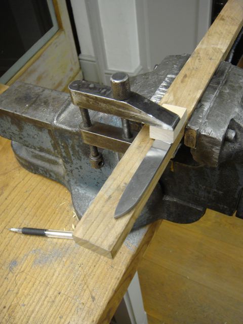 Grob-Anlegen der Schneide, hier einfach gefeilt, dazu klemme ich die Klinge mit einer Werkzeugmacher-Klemme an eine Holzkantel