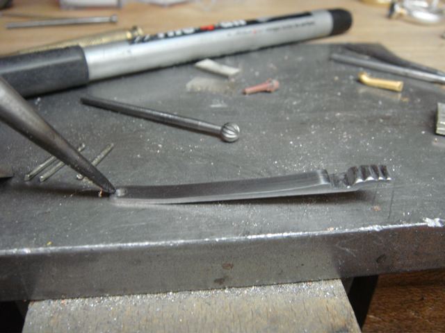 Grob gefeilt und geschmirgelt - Schneidkante sollte noch ca 1mm stark sein und Klinge ohne grobe Rieffen (wegen Rissgefahr später beim Härten)