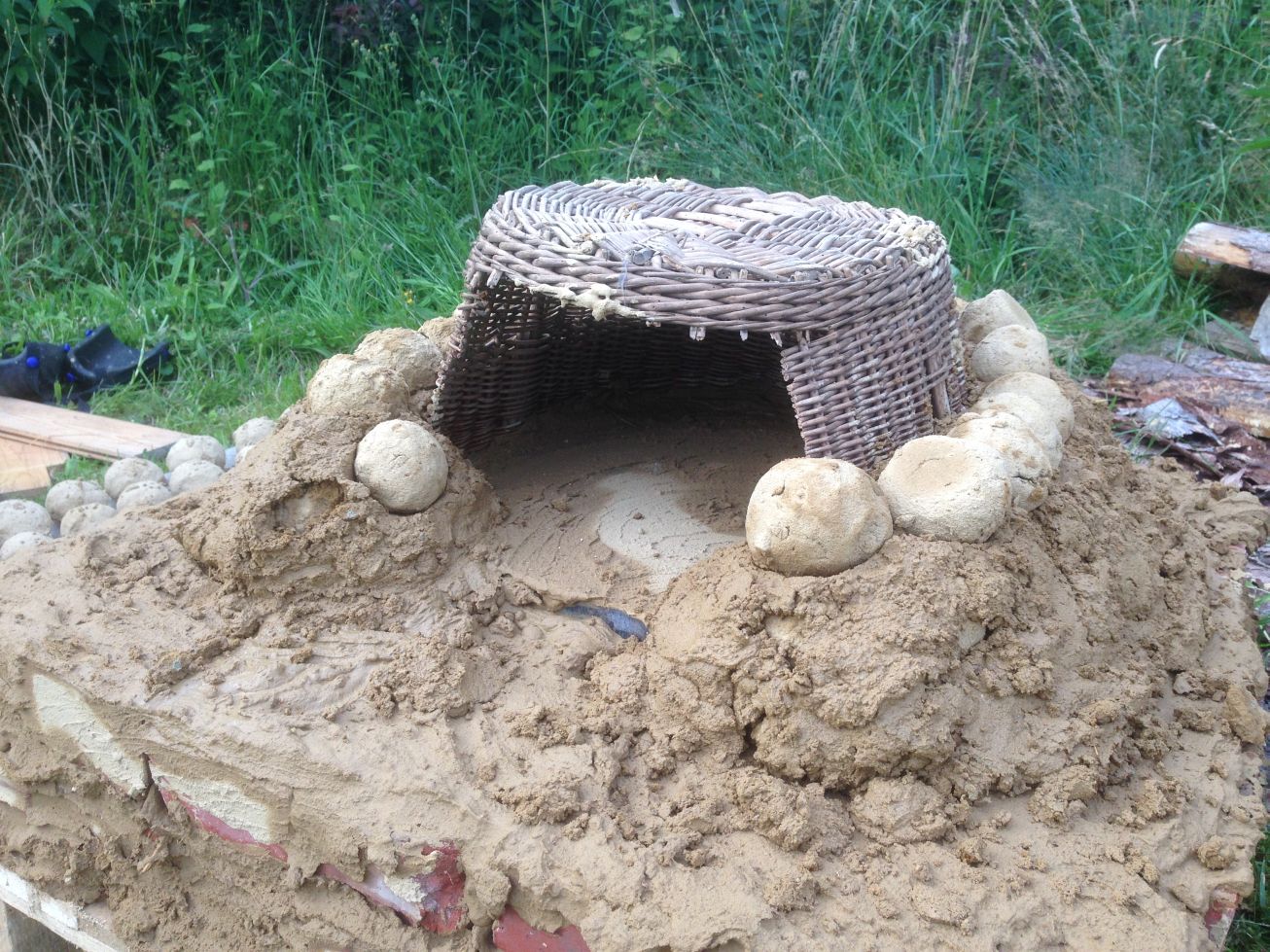 Der Weidenkorb war eine praktische Lösung, aber man kann genausogut aus Weidenruten eine grobe Kuppel formen und da drumrum bauen. Muss man halt in der Zeit einplanen.