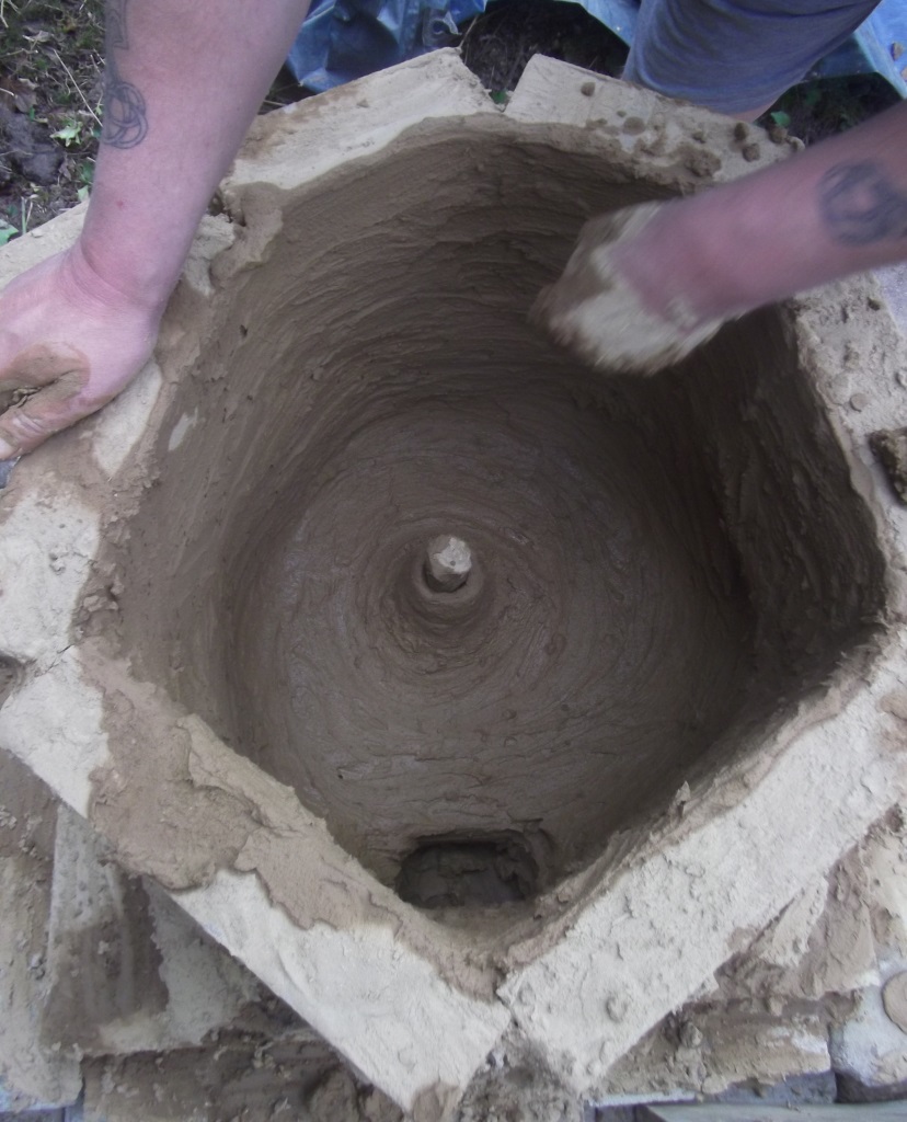 Der Ofen ist Innen bereits vollständig verkleidet, es wurde auch bereits eine ersten Außen-Lehmschicht aufgebracht