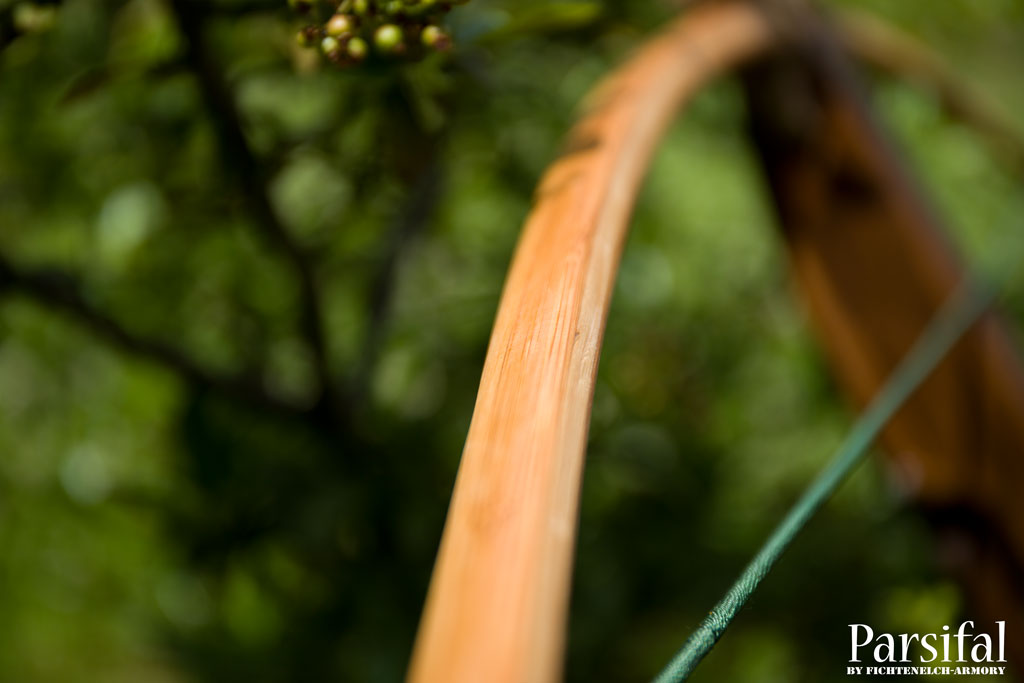 Ich habe den Bogen bewusst etwas "overbuild" weil ich eben nicht so oft mit "Nurholz" arbeite. Das Auggangsmaterial war ein Bambuslaminat mit 5 mm Stärke und ein Eschenlaminat in 5 mm. Also hab ich das Eschenlaminat linear nach aussen getappert um nen groben "Tiller" zu haben und dann am Bauch und Rücken das Bambus auflaminiert. Den "Feintiller" ...wenn man davon sprechen kann.... habe ich mit Sandpapier am Bauch gemacht. Ach ja....der Bogen ist genau einen Meter Lang.