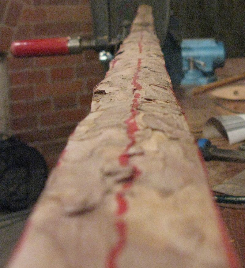 Dadurch, das ich zuerst eine dünne Schicht Epoxy auf die Fügeflächen gegeben habe, hat sich eine feste Schicht gebildet. Die hat dann das passgenaue spleissen verhindert, nachdem ich noch eine Ladung drauf gegeben habe. Dadurch hat sich der Stamm aufgespalten. Sicherlich waren auch die geringen Temperaturen in der Werkstatt unterm Dach mit verantwortlich. Gesägt habe ich den spleiss bei Aussentemperaturen um die 20 Grad...