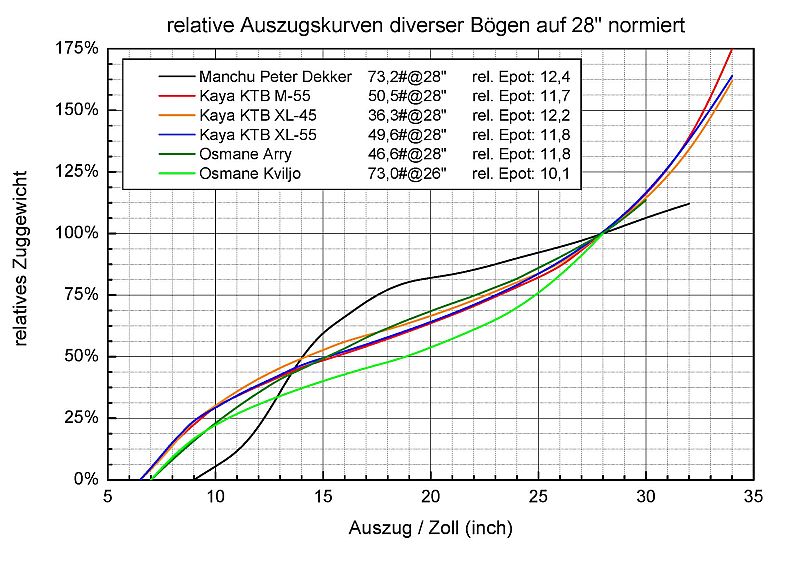 Beim Erstellen der Kurven bin ich wie folgt vorgegangen. Als erstes habe ich die Rohdaten mit einem gleiten Durchschnitt (3 Punkte) geglättet und dabei die Start- und Endpunkte auf die Messwerte zurück korrigiert (Startwert wäre überschätzt und Endwert deutlich unterschätzt). Anschließend wurden alle Kurven auf das Zuggewicht bei 28" Auszug normiert (also dort auf 100% gesetzt), um sie irgendwie vergleichen zu können. Für den Osmanen von Kviljo musste ich dazu die Daten extrapolieren (der Bogen ist auch für mehr als 28" Auszug gedacht konnte nur nicht soweit gezogen werden). Eine Normierung der maximal angegebenen Auszuglänge, wie u.a. von Galighenna vorgeschlagen, habe ich unterlassen, da ich nicht weiß, ob die Bögen gleichmässig maximal ausgezogen wurden.