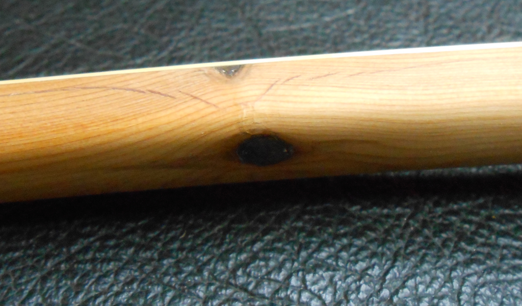 Ziel ca. 30# bei 28'', wobei sie wahrscheinlich nur 27 '' Auszug hat. Der Bogen ist eigentlich fast fertig, hat aber bei 27'' noch gut 30# Zugkraft. Das Problem ist jetzt ein Ast im oberen WA, auf dem Bild liegt der Ast rechts genau bei Strich 6. Beim Einschießen, nach ca. 100 Schuß sieht es jetzt so auch, als wenn sich ein Spahn abheben will. Wie kann ich das denn jetzt noch sichern, damit der Bogen nicht noch bricht.