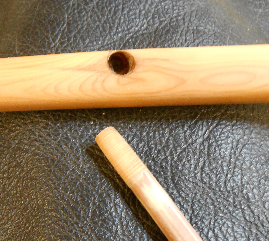 b) den Ast und den angebobenen Span ausbohren und einen passenden, der Holzmaserung des Bogens angepasstes Stück Holz einleimen + wickeln