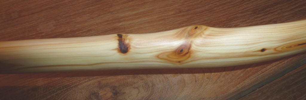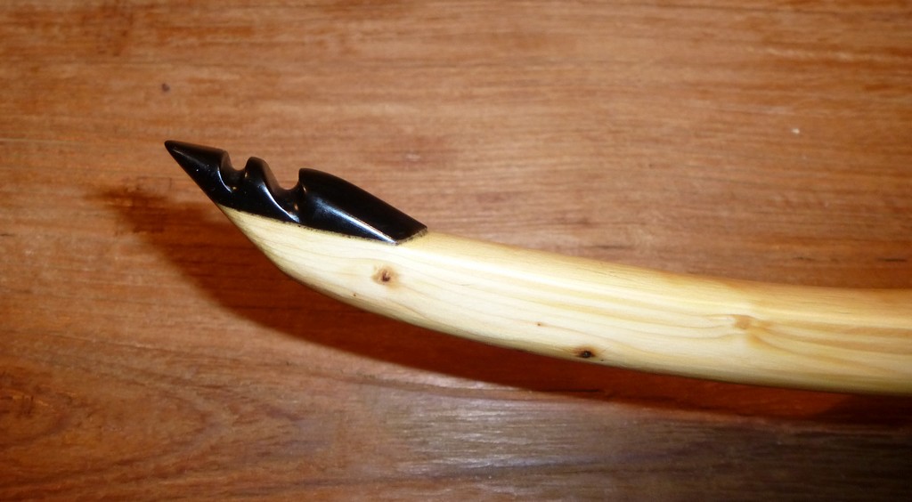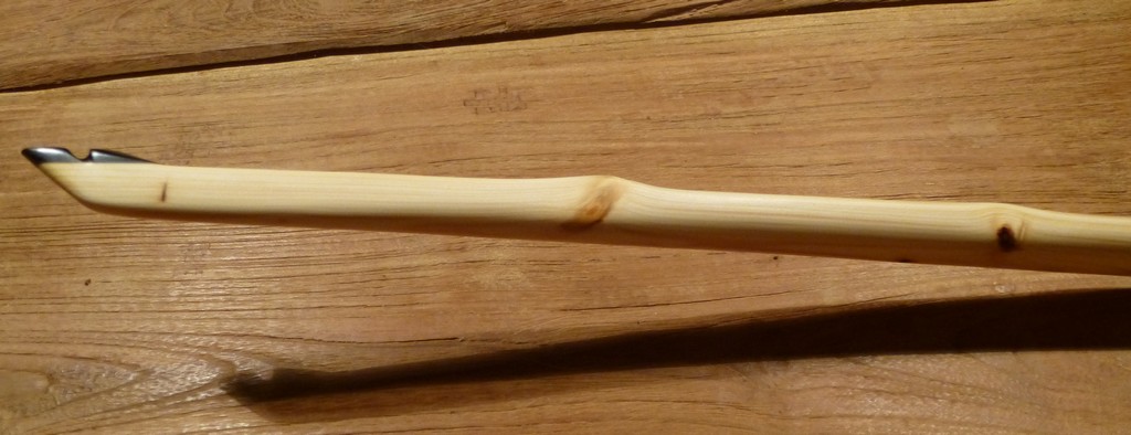Das dünne Ende habe ich geflippt und so gebogen, dass die Sehne halbwegs durch die Mitte geht. Der fertige Bogen erinnert mich sehr an meinen ersten Kirschbogen