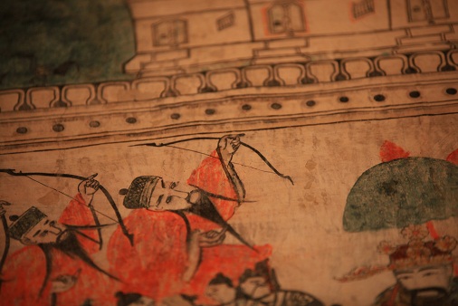 Es zeigt ein Fresko, darstellend eine chinesische Gesandtschaft auf dem Weg zum laotischen Koenigshof im 19. Jh. .