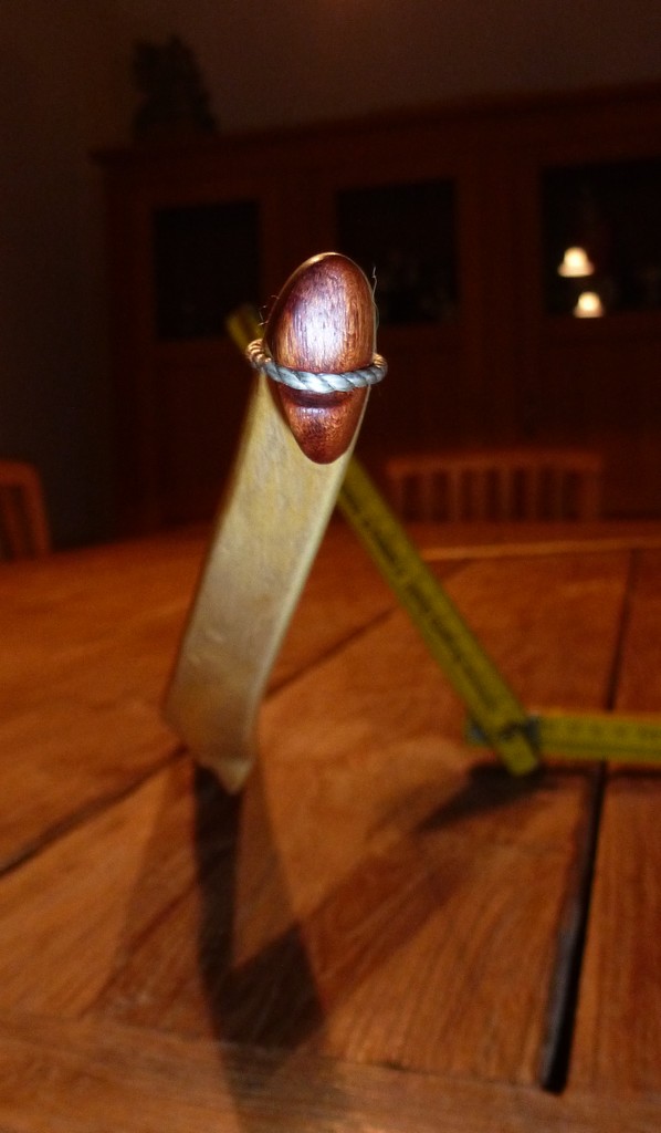 Am oberen Tip gab es eine Fehlstelle, die ich mit einem Holzpflaster aus dem gleichen Stamm versehen habe und da die Sehne im Laufe des Tillerns aus der Bogenmitte gelaufen ist, wurde der Bogengriff leicht mit Dampf gebogen. Um das Holz nicht so stark zu belasten, sollte der Griff mitbiegen. Leider ist mir das nicht so wirklich gelungen und zurzeit stecke ich bei 25 Zoll Auszug fest.