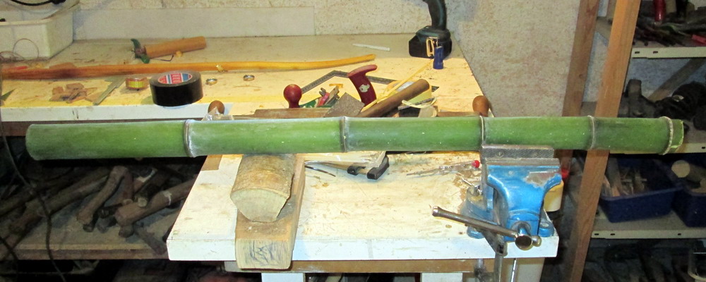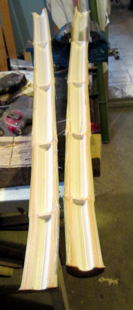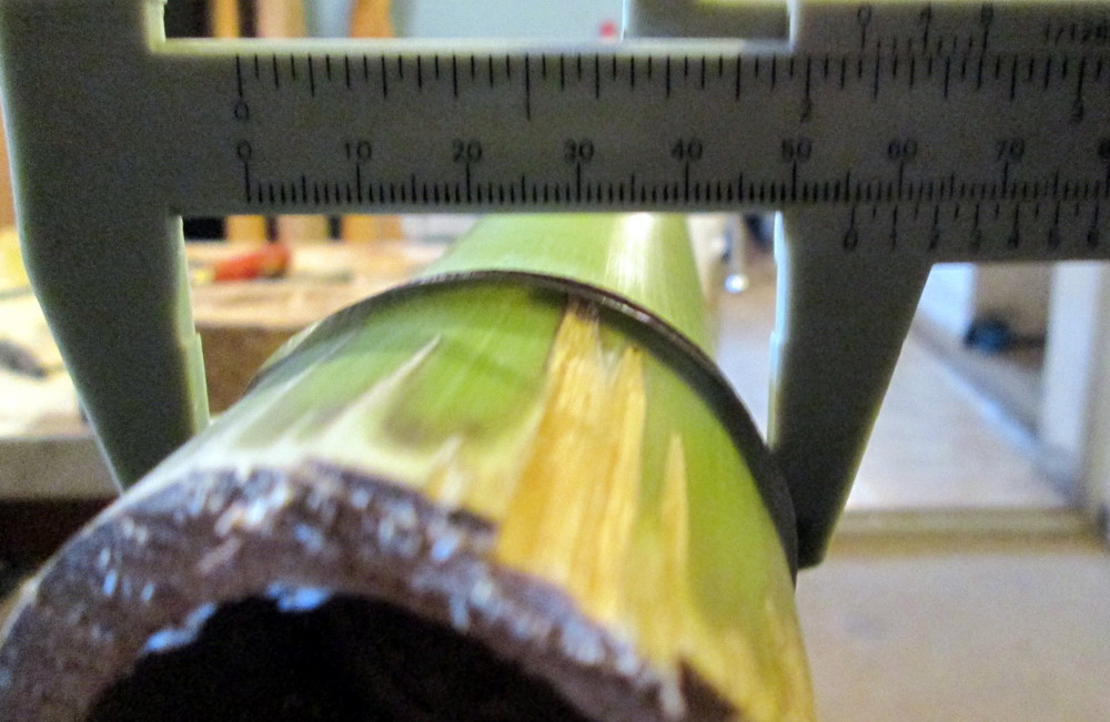 Das Bild beantwortet die Frage, man sieht dass der für den Spleiß ausgeschnittene Keil eine Wandstärke von 15mm hat, die Wandstärke des Rohres nimmt auf den ersten Internodien stark ab. Dies kann man ausnutzen um dem Bogen in der Mitte die nötige Steifigkeit zu verleihen.