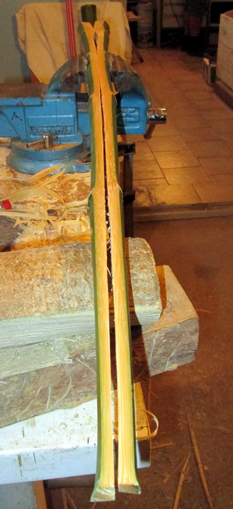 die beiden Spalthälften werden nun weiter bearbeitet, der Spleiß wird im untersten Internodium des Rohres liegen.