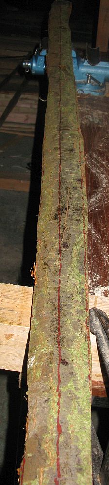 Die Rinde muss noch ab und ein Dickentaper von 3cm auf 2cm wird noch abgearbeitet. Bei einer Länge von 2m ist hier sicher ein D-Tiller drin. Höchstwahrscheinlich wird sich der Stave beim Trocknen verwerfen. Ich hoffe, dass durch die Breite von 7cm noch genug Möglichkeiten für einen geraden Sehnenverlauf drin ist.