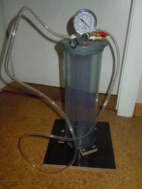 Das ist im wesentlichen ein dickwandiges klares PVC-Rohr mit O-Ringdichtung, Manometer , den entsprechenden Anschlüssen und ganz wichtig einem Leckventil. Die Grundplatte hab ich selbst angebracht. Durchmesser der Kammer 4“ Länge 14“. Vakuumpumpe: