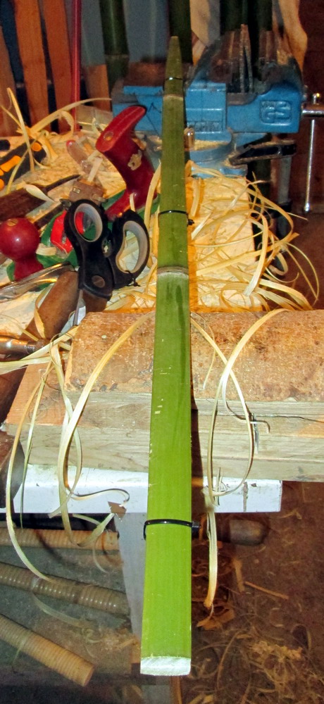 wenn die trocken sind werden sie im Griff gegengleich verspleißt und aufeinander laminiert, das sollte einen fertig getillerten 2 Schicht Bambus Stabbogen ergeben.