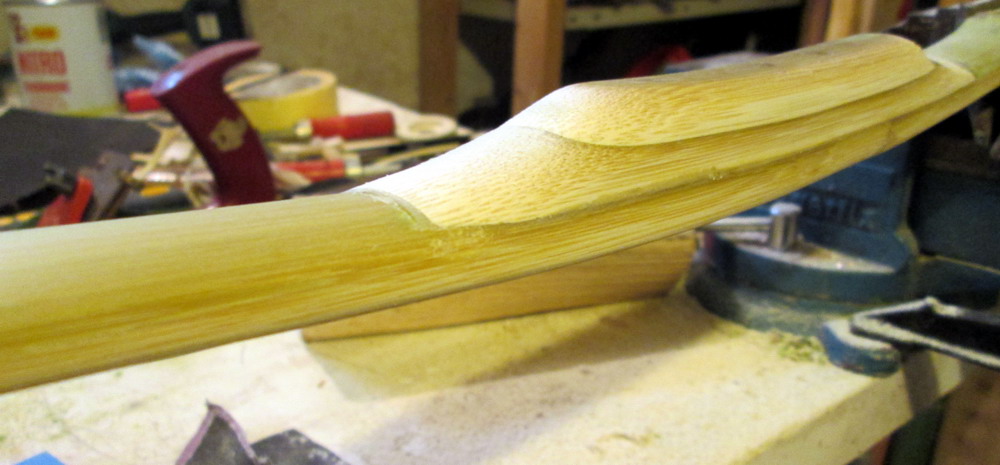 Auch die Wurfarme werden in Form gebracht und verschliffen, Hier sieht man beeindruckend den stark konkaven Rücken. Auch sind hier bereits die Internodien verschliffen, was beim klassischen Bhutan unmöglich wäre, aber das wird kein klassischer Bhutan sondern ein Bhutan-Hybrid