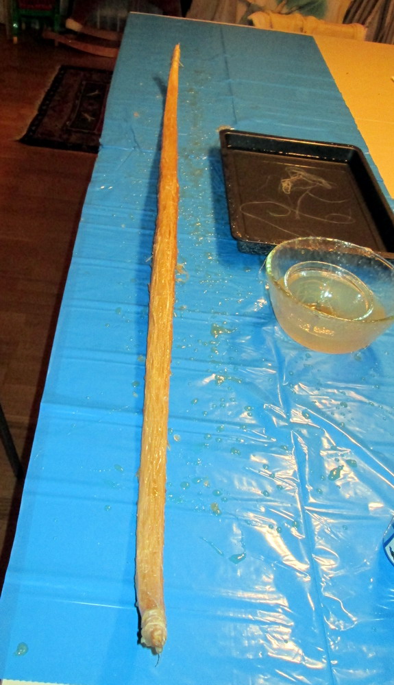 muss alles auf einmal drauf. Die Schwierigkeit dabei ist den Überblick zu behalten wieviel Sehne wo schon drauf ist. Die Sehne quillt mit dem Leim auf sodass die 3 Schichten am Griff schon gewaltig dick und unübersichtlich werden.