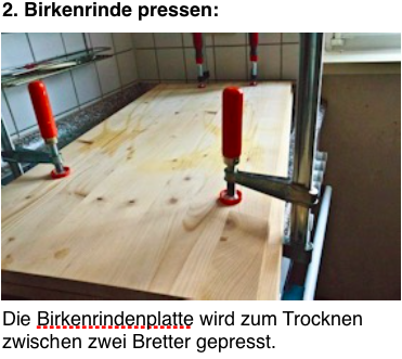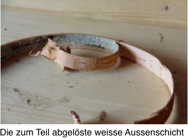 Nun wird die Birkenrinde von der weissen Aussenschicht befreit. Da die weisse Rindenschicht nicht zu verwenden ist, muss sie abgelöst werden. Die Rinde mit der weissen Schicht wölbt sich immer nach innen. Diese Seite wird auch zum Verkleben verwendet. Die gold-gelbe Rindenschicht bildet dann die Aussenseite.