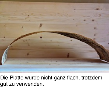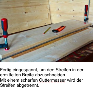 Die Rinde wird mit Hilfe eines Schneidelineals, dass zwischen zwei Bretter geklemmt ist, auf die notwendige Breite geschnitten.