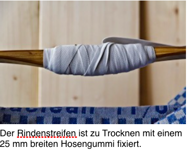 Der Bogen wird nun in einer Vorrichtung festgebunden, damit ich zum Verkleben beiden Hände frei habe. Zuvor wurde der Rindenstreifen in warmen Wasser zum Umwickeln wieder geschmeidig gemacht.