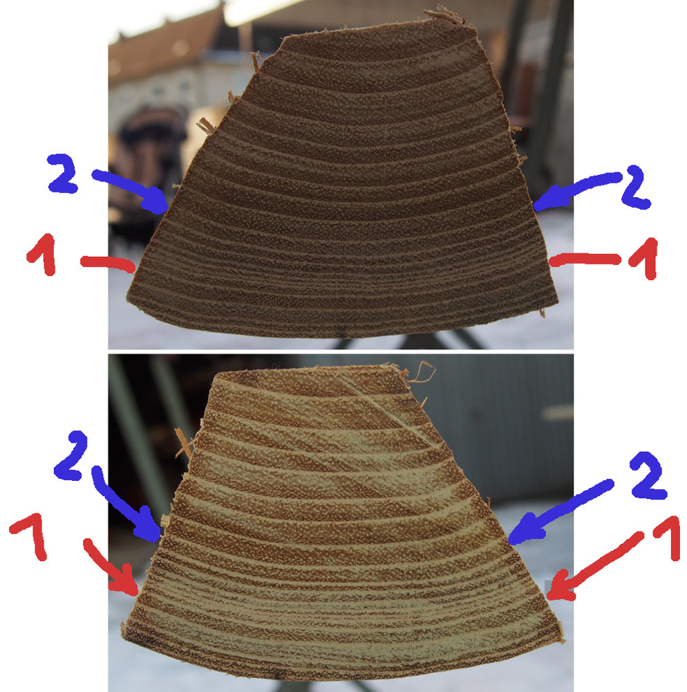 Ich habe mit Robinie keine Erfahrung und würde euch bitten die Jahresringe zu bewerten. Im Foto habe ich zwei Ringe markiert von denen ich denke, dass sie einen geeigneten Rücken abgeben würden. Bitte um Ratschläge!