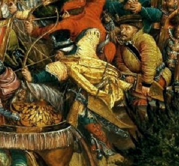 Hier fliehen Bogenschützen der russischen Adelsreiterei vor polnischen Husaren. Zwei beherrschen offensichtlich den "parthischen Schuß" obwohl sie mediterran schießen (und mit sehr hohem Anker). Auffällig ist auch der wohl unter dem Einfluß der "Goldenen Horde" übernommene "östliche Sitz" mit kurzen Steigbügeln, der (angeblich, hab das noch nie probiert) das Bogenschießen zu Pferd einfacher machen soll.