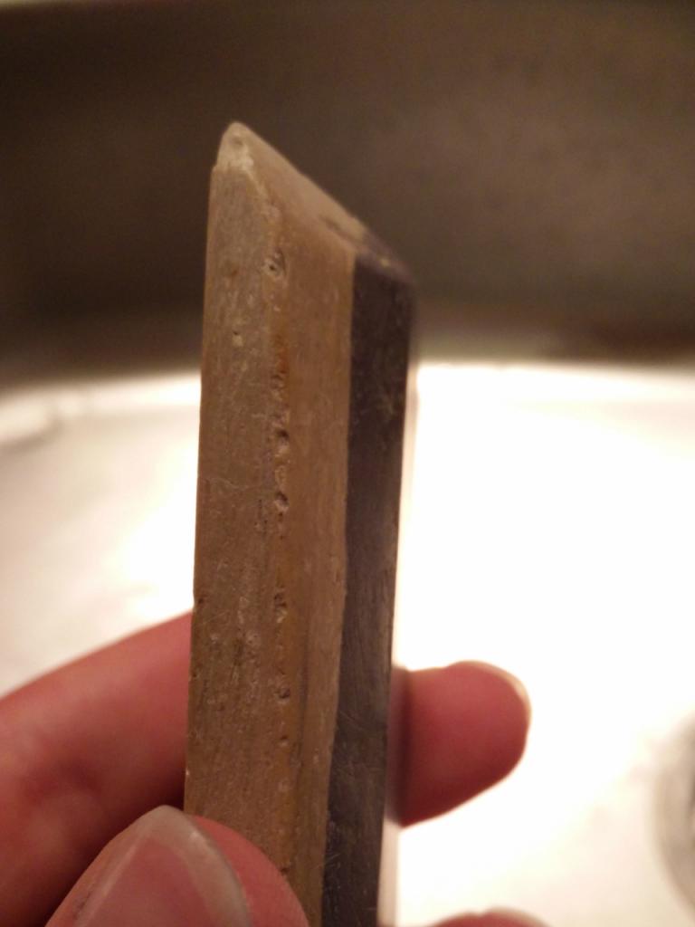 Allerdings ist er zweifarbig. Eine Seite ist gelb, eben mit diesen rötlichen relativ gleichmäßig verteilten einschlüssen, und die andere Seite ist Lila. Die Farbe ist schwer zu beschreiben. Beide Seiten Irisieren leicht, wenn man sie ins Licht hält. Auf diesem Stein schärfe ich nur, was wirklich wirklich wirklich sau scharf werden soll. Er trägt zwar nicht viel ab, aber der Schliff ist unvergleichbar fein. Ich nutze ihn als Polierstein, wenn ich das Messer bereits geschärft habe, um den Grat ab zu ziehen und die endgültige Schärfe zu erzeugen.