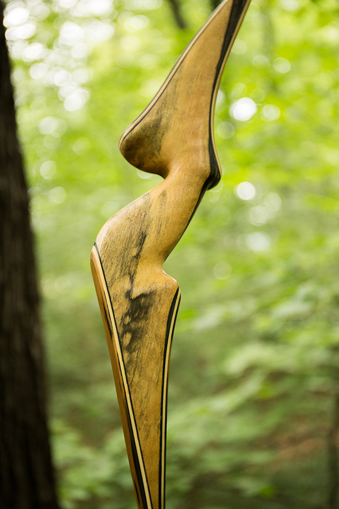 Das Design hat mich damals überzeugt und es kann ja nicht sein das einer meiner "Kunden" nen schnelleren Bogen als ich hat. Alsoooo.... die Unterschiede zum Vorgänger sind: Zirkote-Furnier unter 1 mm Klarglas (wieder das "gute"), die "Recurves" arbeiten jetzt sanft mit, es ist keine extra Schicht Bambus mehr in den Recurves ...sondern die sind mit ner Schicht Carbon verstärkt, ab beginn der Recurves ist der Bogen nur noch 9 mm breit und somit hat er weit weniger Handshock als sein Vorgänger..der Auszug ist jetzt bei "Alexfreundlichen" 30 Zoll ...nur mit den 53 Pfund tu ich mir auf Dauer noch etwas schwer.. nach 40-50 Pfeilen ist da bei mir einfach die Luft raus. Dafür hab ich etwas mit der Griffform "gespielt" und meine Hand sitzt bei dem Bogen wirklich perfekt "im Bogen". Als alter "Klammerer" mag ich es einfach wenn der Griff etwas ergonomisch ist. Ausserdem zwingt mich der Griff den Arm in der richtigen Haltung zu halten, denn einen Sehnentreffer auf dem Unterarm mit dem Bogen tut echt wehhh! :D