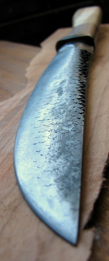 Hab mich mal im Schmieden versucht...Die Flohmarkt-Raspel wurde leider nicht heiß genug, um sie schön breitzuklopfen. Da fehlten noch so 200 Grad. Deshalb ist weniger ein Koch-, eher ein Piratenmesser draus geworden.