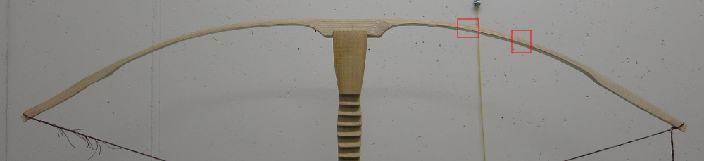 "Normalerweise" lässt man bei einem Astloch etwas Material überstehen. Man baut im Wurfarm eine steife Zone ein. diese beginnt und endet natürlich nicht nur im Bereich des Astes sondern läuft davor und dahinter etwas aus. So ergeben sich mit jeder dieser Stellen etwa 5cm nicht biegender Bereich.