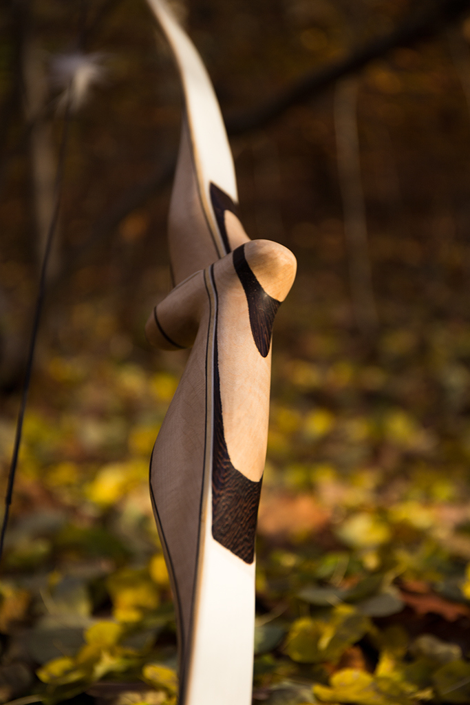 Den Bogen habe ich bewusst etwas asymetrisch gebaut. Der obere Wurfarm ist knappe 3 Zoll länger als der untere und hat auch ein leicht anderes Design.Das war eine Übung für ein Winterprojekt (laminierter Yumi) und ich muss sagen so schlecht geht das gar nicht! Der Bogen lässt sich sicher und weich bis 30 Zoll ziehen, Wirft unglaublich leise und angenehm schnell (209 fps mit 400 Grain Pfeil). Beim oberen Wurfarm habe ich an den Tips die Sehnenkerben weglassen müssen dafür hängt dort die Sehne quasi in nem Hacken.
