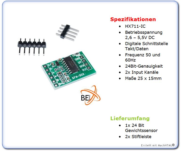 - Messerverstärker ist ein Hx711. der recht einfach mit dem Arduino kommuniziert. Technische Daten sind soweit erhältlich beigefügt