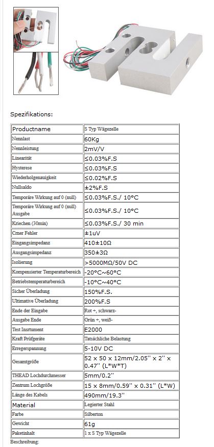 - Kraftmessung via DMS bestückten Messmodul. Technische Daten im Bild beigefügt. Wichtig bei einem anderen Messfühler ist die Empfindlichkeit, hier waren es 2mV/V