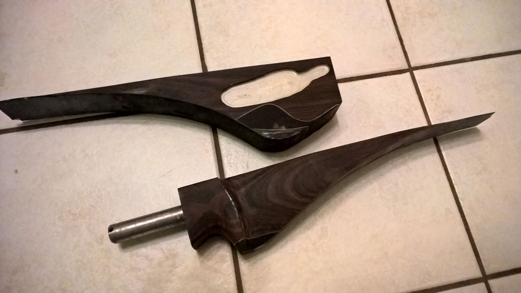 Der fast fertige Bogen wurde dann in zwei Hälften gesägt und in einem Teil ein 6 cm langes und 26mm breites Loch gebohrt. (war bei Grenadill ne ganz schöne Arbeit und auch nur mit der Standbohrmaschine möglich)