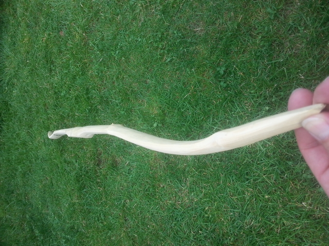 Von der Mitte der Wurfarme Richtung äußeres Drittel.Links, im oberen Wurfarm, liegen genau da ein paar Knubbel im Holz. Rechts liegen ähnliche Knoten am Anfang des letzten Drittels. Da tu ich mich total schwer eine schöne Biegung hinzubekommen. Aber ich versuch es weiter ;-)