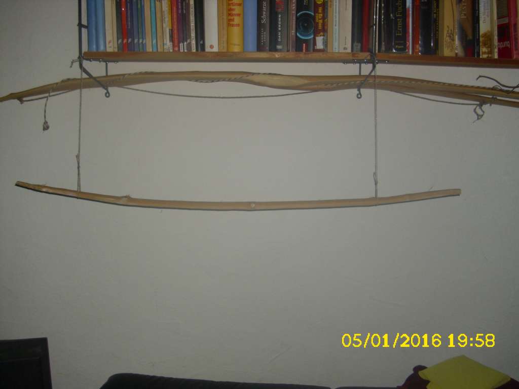 @ Coal:Keine Sorge, hab aus einem Ast (ca 5cm dick, 130cm lang)l des gestrigen Hollers vorhin einen Testbogen im Schnellverfahren geschnitzt. Der hängt jetzt im Wohnzimmer.
