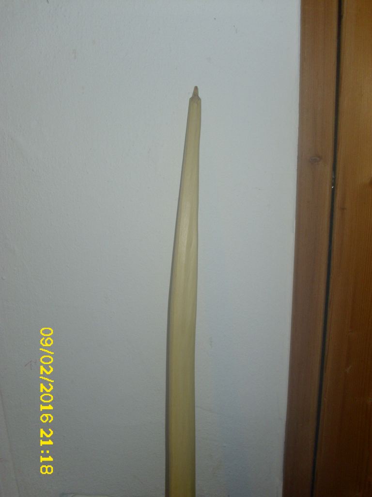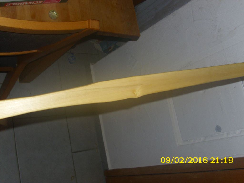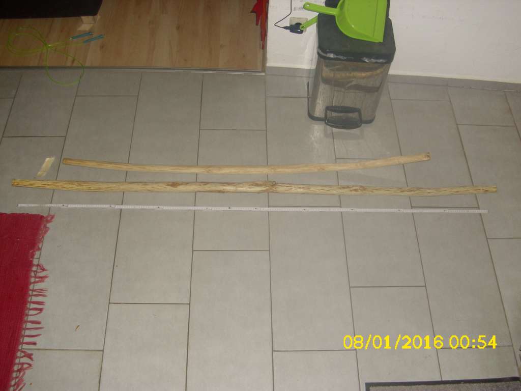 - Hauptstamm Holler (nur noch 157cm) ist mittlerweile von 986g (06.01.2016,zurechtgehauen), auf 708g (heute) herunter, ziemlich snaky geworden,aber die Mittellinie durch den "Griff" (wird ja ein griffloser) stimmt immer noch wie vorausgesehen.Er wird immer reflexer, Jetzt schon 130mm, respektive ca. 65mm für jedes Ende von der Mitte aus. Dicke derzeit 22mm in der Mitte, 17mm an den Tips; gut viel Fleisch, wenn er will über 45#, wenn ich kann über 50#, mal sehen.... da war ja noch der faulige Stinketeil, mittlerweile fast weggeschnitten. Toitoitoi....