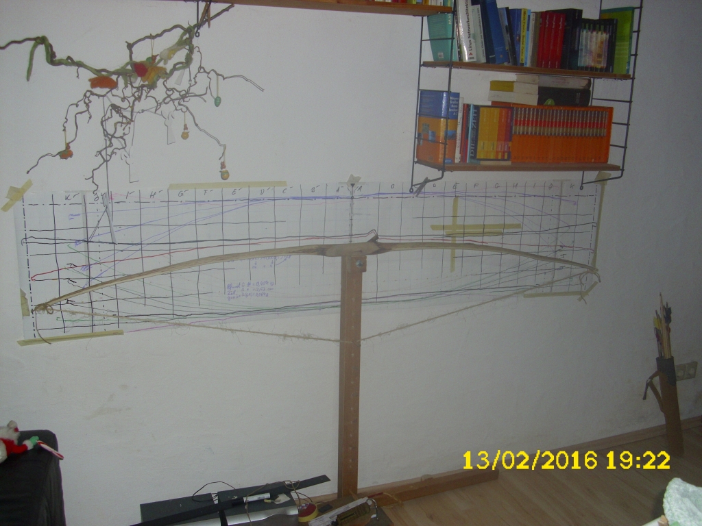 - erstes Mal auf dem Tillerbaum, noch rabiate 70#, viel zu viel für das Holz und mich - heutiges Photo, >55# (weiter geht meine Federwaage nicht, die vorherigen Werte waren hochgerechnet) bei 28", für einen 2m-Bogen für mich ein bißchen zu viel, geplanter auszug sind 33-34" bei ca. 55#,da muß noch ein bißchen getan werden, vor allem der Griff, Sehne muß ich auch noch bauen, finishen, naja wird knapp. - im Griff wurde er gedämpft,da er sich hier nach dem groben Zuschnitt etwas seitlich verzog (nur der Griff), verantwortlich war mit Sicherheit der prominente Ast in der Mitte Mal sehen, ob ich den noch in die Präsi krieg.