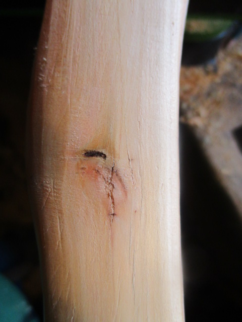 Nun der Faulbaum: Die Sehne lief nicht so toll; also nochmal mittig im Griff weiter aufgesägt; dannn mit Hitze gerichtet und anschließend im Schraubstock mit Kleber verfüllt.