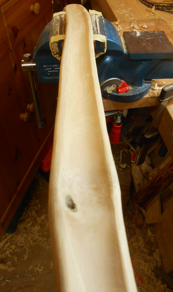 Den Hollunder habe ich heute auch weiter ausgedünnt, den Griffbereich ausgedünnt und abgeflacht und zusätzlich die Wurfarme ausgehöhlt. Er hat jetzt immer noch eine Breite von ca. 55 - 60 mm an den FO und ist auch noch zu dick, aber vor dem Runterbiegen im Griffbereich wollte ich ihn nicht zu dünn machen.