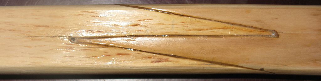 Die Kerben sind so tief und so weit draussen, um dem Druck der Sehne auf das Eibenholz entgegenzuwirken. Sieht schon etwas angespleisst aus, das stimmt, aber auch schön