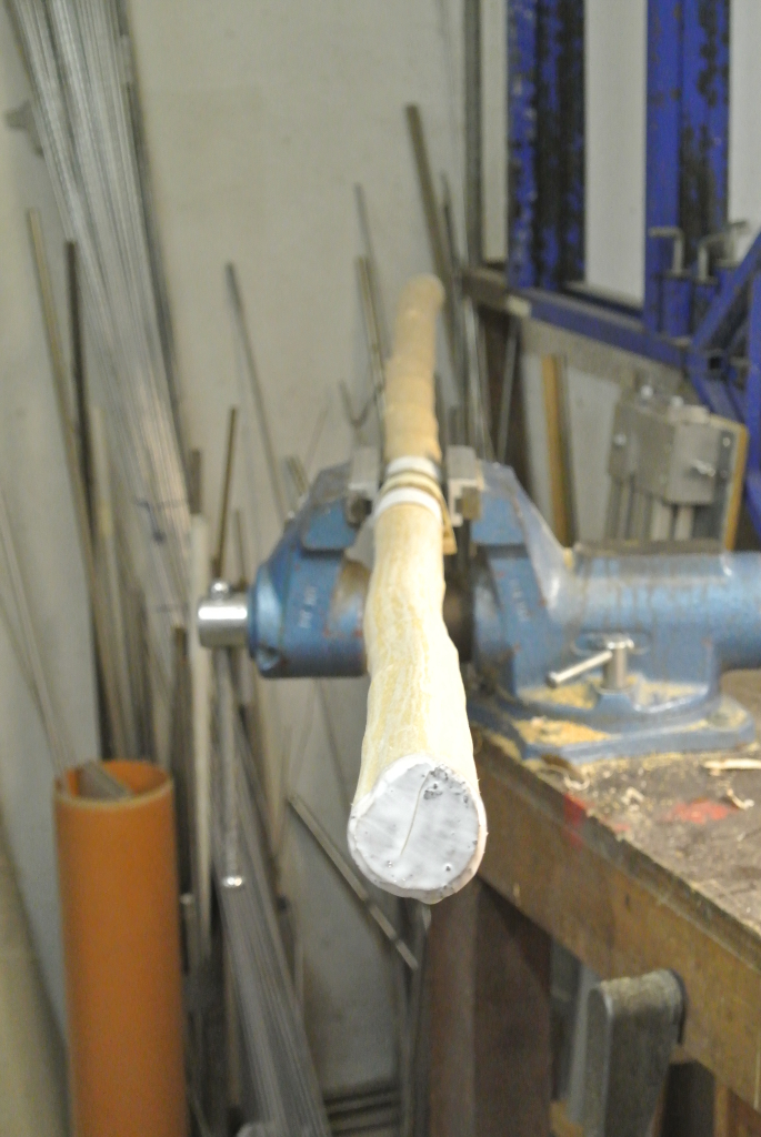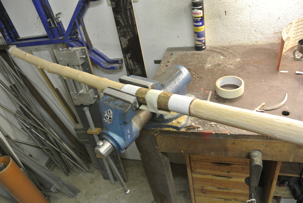 Im Griffbereich habe ich die Rinde drauf gelassen, es soll eventuell auch bis zum Schluss so bleiben da er von Durchmesser so schon gut in der Hand liegt.