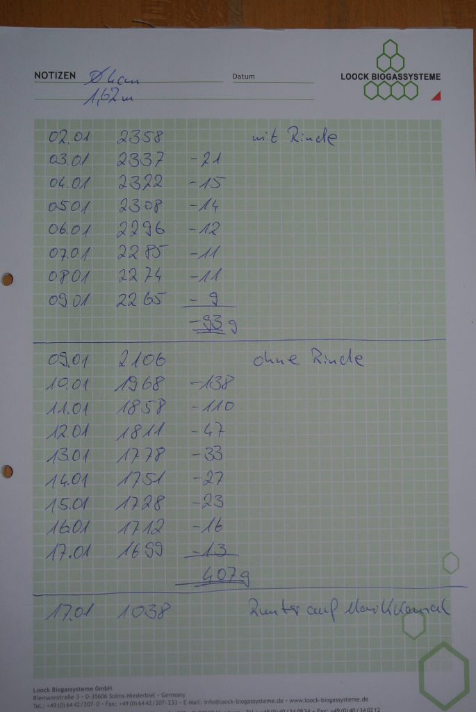 Das Trocknungs-Verhalten ohne Rinde war auch recht interessant, extremer Wasserverlust in den ersten zwei tagen dann pendelt es sich langsam ein.