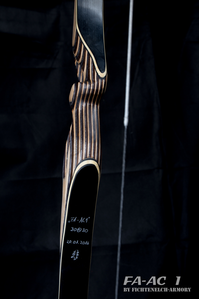 Bleibt noch zu sagen das das Griffdesign eigentlich anfangs nicht so geplant war. Aber als ich den eigentlichen Griff geschliffen habe ist mir aufgefallen das genau im kritischen Bereich ne Klebefuge ist. Ich hab zu dem Zeitpunkt noch nicht gewusst wie stark der Bogen sein würde. Deshalb die Lösung mit dem dünnen "Griff" auf dem Rücken. Dieses Teil ist durch 6 Stahlstifte mit dem hinteren Teil des Griffes verzapft und bildet so quasi ne "Kraftbrücke" zwischen den Wurfarmen. Ausserdem ist es mal was anderes ...funktionieren tuts auch top und auch wenn sich jetzt bestimmt noch einige die Augen kratzen......so schlecht siehts gar nicht aus. Find ich.