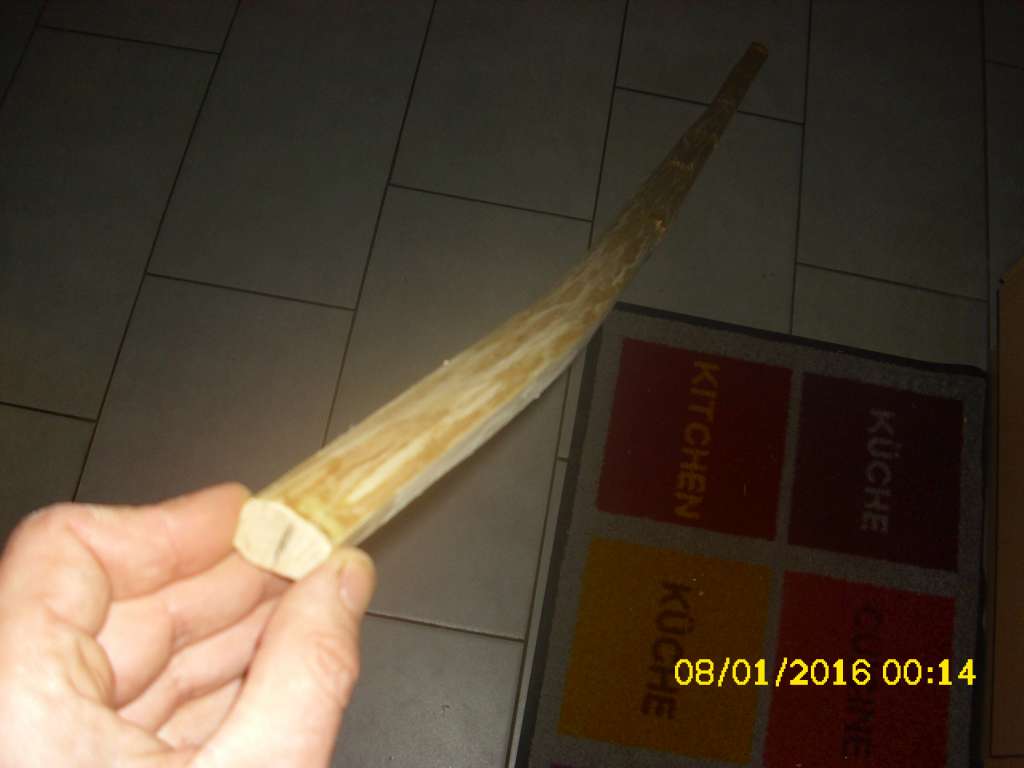 - Hauptstamm Holler (nur noch 157cm) ist mittlerweile von 986g (06.01.2016,zurechtgehauen), auf 708g (heute) herunter, ziemlich snaky geworden,aber die Mittellinie durch den "Griff" (wird ja ein griffloser) stimmt immer noch wie vorausgesehen.Er wird immer reflexer, Jetzt schon 130mm, respektive ca. 65mm für jedes Ende von der Mitte aus. Dicke derzeit 22mm in der Mitte, 17mm an den Tips; gut viel Fleisch, wenn er will über 45#, wenn ich kann über 50#, mal sehen.... da war ja noch der faulige Stinketeil, mittlerweile fast weggeschnitten. Toitoitoi....