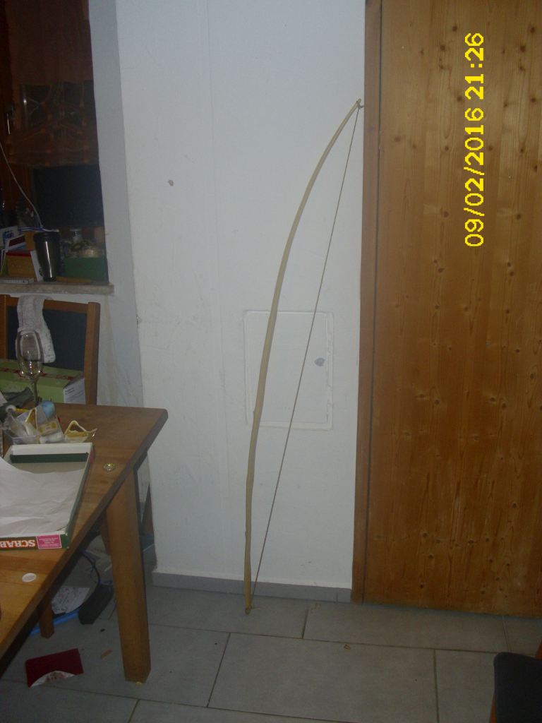 - erstes Mal auf dem Tillerbaum, noch rabiate 70#, viel zu viel für das Holz und mich - heutiges Photo, >55# (weiter geht meine Federwaage nicht, die vorherigen Werte waren hochgerechnet) bei 28", für einen 2m-Bogen für mich ein bißchen zu viel, geplanter auszug sind 33-34" bei ca. 55#,da muß noch ein bißchen getan werden, vor allem der Griff, Sehne muß ich auch noch bauen, finishen, naja wird knapp. - im Griff wurde er gedämpft,da er sich hier nach dem groben Zuschnitt etwas seitlich verzog (nur der Griff), verantwortlich war mit Sicherheit der prominente Ast in der Mitte Mal sehen, ob ich den noch in die Präsi krieg.