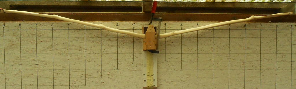 Nachdem der Bodentiller einigermaßen ok war, habe ich die Tillersehne aufgezogen und angefangen den Bogen auf dem Tillerstock zu tillern.