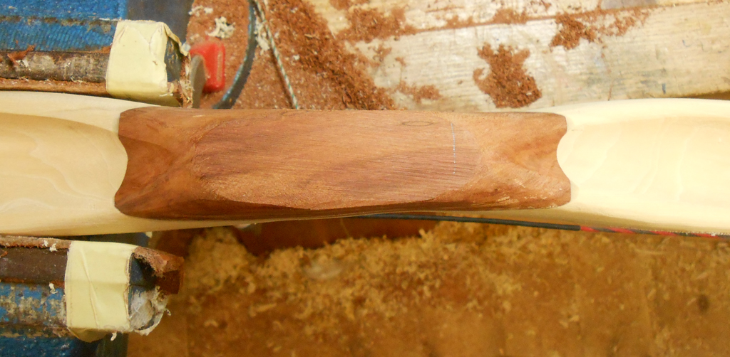 Nach dem Tillern habe ich mir erst einmal ein bißchen Holz für die Griffverstärkung und für die Overlays rausgesucht. Anschließend hab ich das Griffholz zugesägt, geschliffen, den Griffbereich am Bogen plangeschliffen und mit Epoxy verklebt.
