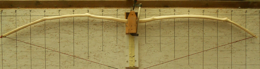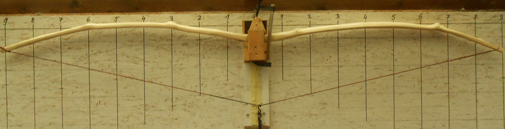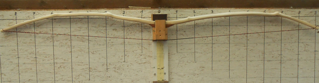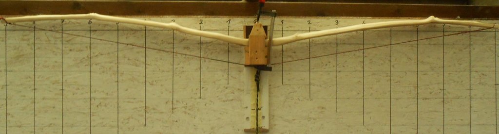 Die Wurfarme habe ich weiter ausgedünnt und dabei immer darauf geachtet, dass sie möglichst in allen Bereichen eine gleichmäßige Stärke haben.Nachdem der Bodentiller einigermaßen ok war, habe ich die Tillersehne aufgezogen und angefangen den Bogen auf dem Tillerstock zu tillern. Das ist bei dem Reflex ein echter Krampf, jedes Mal muß ich den Bogen mit einer Schraubzwinge festsetzen, damit er nicht umschlägt.