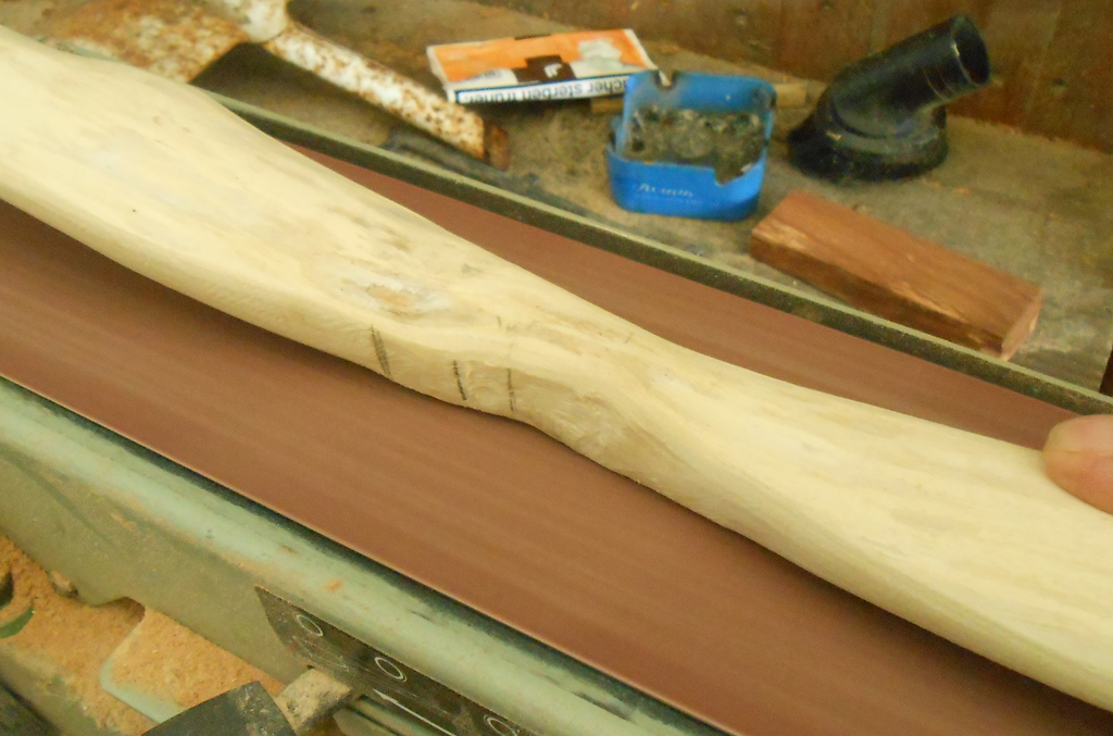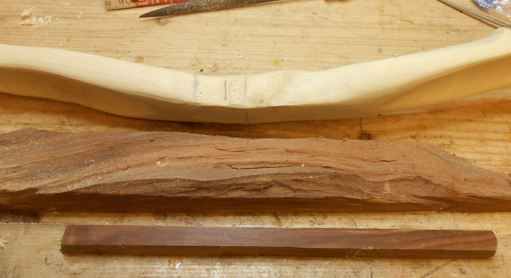 Nach dem Tillern habe ich mir erst einmal ein bißchen Holz für die Griffverstärkung und für die Overlays rausgesucht. Anschließend hab ich das Griffholz zugesägt, geschliffen, den Griffbereich am Bogen plangeschliffen und mit Epoxy verklebt. aber dann ...